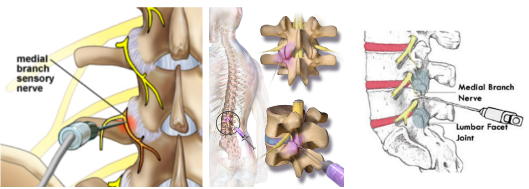 - 신경차단술/주사치료 MBB(Medial Branch Block) : 통증을 유발하는 신경 부위에 스테로이드나 국소 마취제 등을 주사하여 염증과 통증을 완화하는 방법입니다. 다리쪽으로 저린 디스크성 통증 보다는 허리에만 집중된 통증이나 후관절 증후군(Fascet Joint Syndrome)에 효과있는 시술 방법입니다.