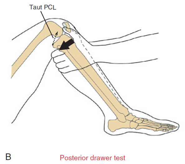 그렇기 때문에 십자인대 손상 검사로 전방십자인대는 대퇴에 비해 무릎을 앞으로 당겼을 때 느슨한 정도를 파악하고(Anterior drawer test), 후방십자인대는 대퇴에 비해 무릎을 뒤로 밀었을 때 느슨한 정도를 파악하여(Posterior drawer test) 손상여부를 판단하고 MRI를 통해 확진할 수 있습니다.